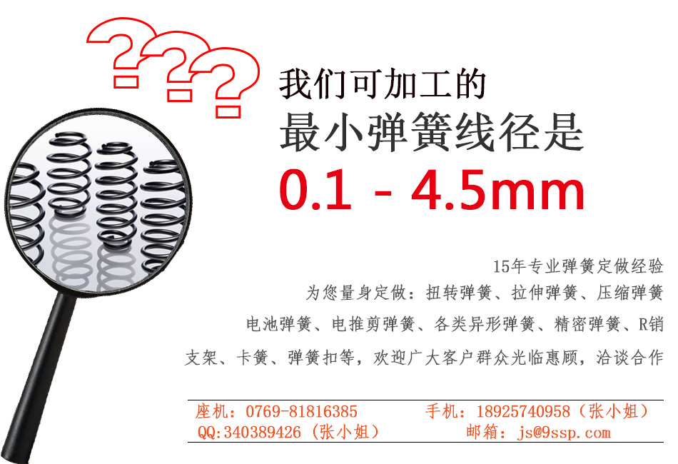 玖胜电池弹簧加工厂家以打造中国一流的耐疲劳弹簧为目标,专注耐疲劳弹簧15年,产品广泛应用于电器、开关、玩具、电子开关、汽车配件等行业。电池弹簧加工厂家已经通过IS9001质量体系认证, 弹簧检测设备仪器齐全,如:投影仪、扭力测试机、压拉力测试机、盐雾测试机,寿命测试机等 ,以诚信、实力和产品的质量获得业界的认可